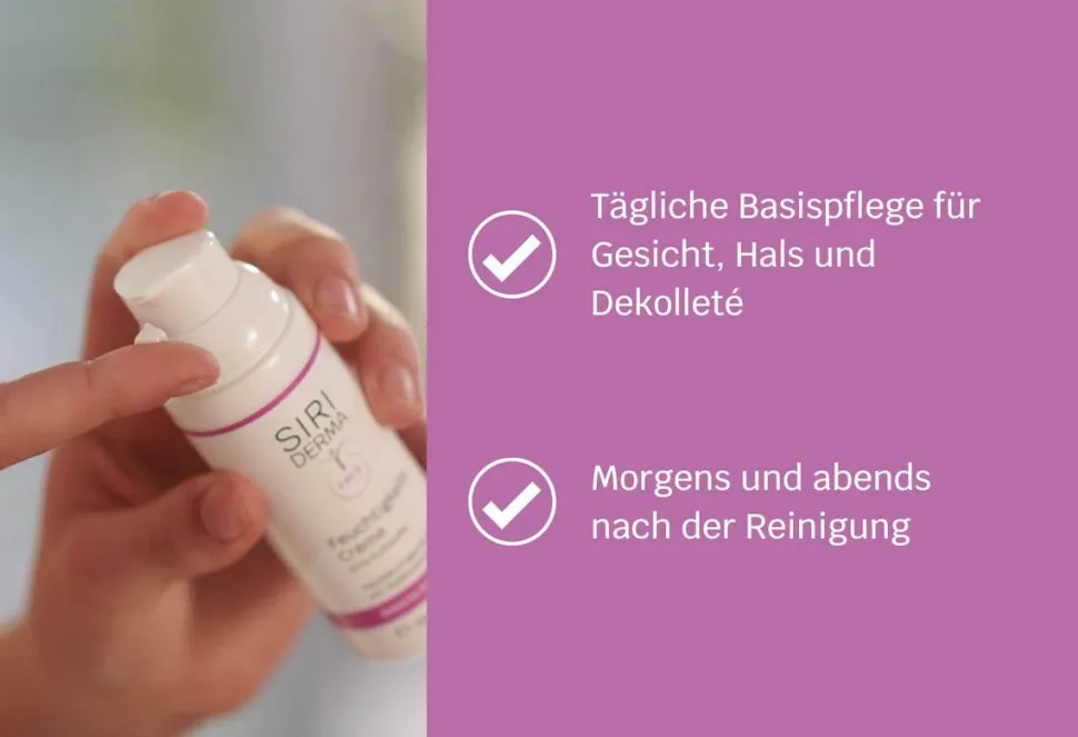 Erste Fältchen lassen sich deutlich verringern. Ausschließlich hochwertige, pflanzliche Öle mit ihren essentiellen Fettsäuren und der besondere SIRIDERMA®-Mineral- & Vitamin-Wirkkomplex erhöhen die Vitalität der Haut. Die SIRIDERMA® FEUCHTIGKEITSCREME unterstützt die Entschlackung und fördert den Regenerationsprozess der Haut. Der Feuchtigkeitsgehalt der Haut nimmt deutlich zu. Die Haut kann sich schon nach kurzer Anwendungszeit fühlbar entspannen, wirkt wieder frisch und belebt und fühlt sich angenehm glatt an. Die Feuchtigkeitscreme eigent sich auch für besondere Pflegebedürfnisse, wie bei Couperose oder Rosazea.