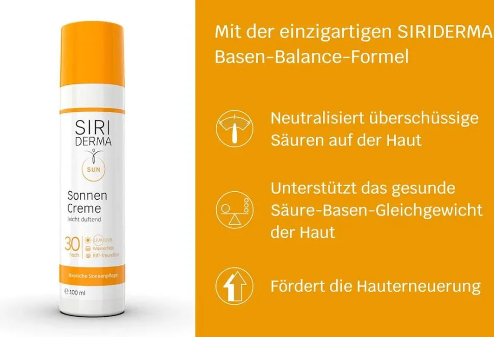 Die Haut wird direkt beim Auftragen geschützt. Durch den Siriderma-typischen leicht basischen Charakter der Sonnencreme werden Säuren, die sich auf der Haut abgelegt haben, wie zum Beispiel durch Schwitzen, beim Eincremen neutralisiert und die Haut wird angenehm beruhigt.