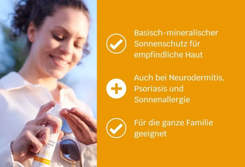 Basisch-mineralischer Sonnenschutz mit Lichtschutzfaktor 30 für empfindliche Haut, auch geeignet bei Neurodermitis, Psoriasis und Sonnenallergie.
